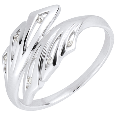 Die klaren Linien der Natur finden sich in der Kurvenform dieses Ringes wieder. Er symbolisiert die Perfektion natürlicher Ursprünglichkeit im Paradies. Dieser Ring wurde von Thais Takase, von der Modeschule ESMOD, entworfen. 6 Diamanten : 0.03 Karat - Weißgold (750/-): 2.5 g. Weitere Abmessungen