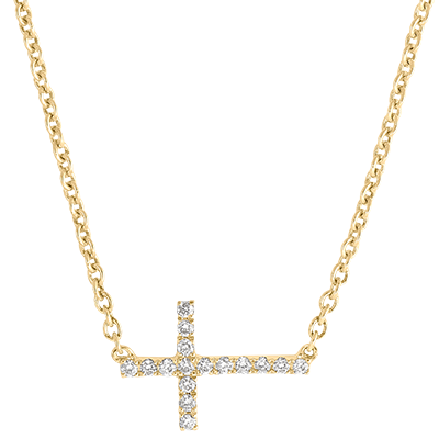 Das Must-have: Eine dünne, zarte Kreuzkette aus Gelbgold, gekrönt von einem minutiös besetzten Diamanten-Pavé, das an einem Kettchen befestigt ist. Kettenlänge 45cm, Einstellring bei 42cm.