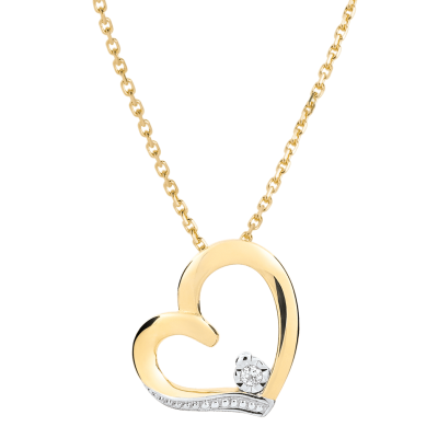 Ein bicolore Herz trägt in der Mitte ein Diamant, das vom Weissgold umgeben ist. Mit Kette 42 cm + Verlängerung von 3 cm; 750/-. 1 Diamant : 0.02 Karat - Weiß-und Gelbgold (750/-): 1.9 g. Weitere Abmessungen