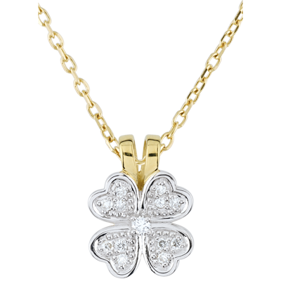 Ein diamantbesetztes Anhänger in Kleeblattform aus Weißgold, dessen besonderes Detail seine gelbgoldene Öse darstellt. Ein klassisches Schmuckstück, welches problemlos mit einer einer Kette in Gelb- oder Weißgold kombiniert werden kann. Ohne Kette. 13 Diamanten : 0.15 Karat - Weiß-und Gelbgold (375/-): 1.3 g. Weitere Abmessungen