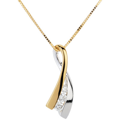 Ein feines Band aus Gelbgold und Weissgold legt sich um eine Kette und hält eine Trilogie aus funkelnden Diamanten.