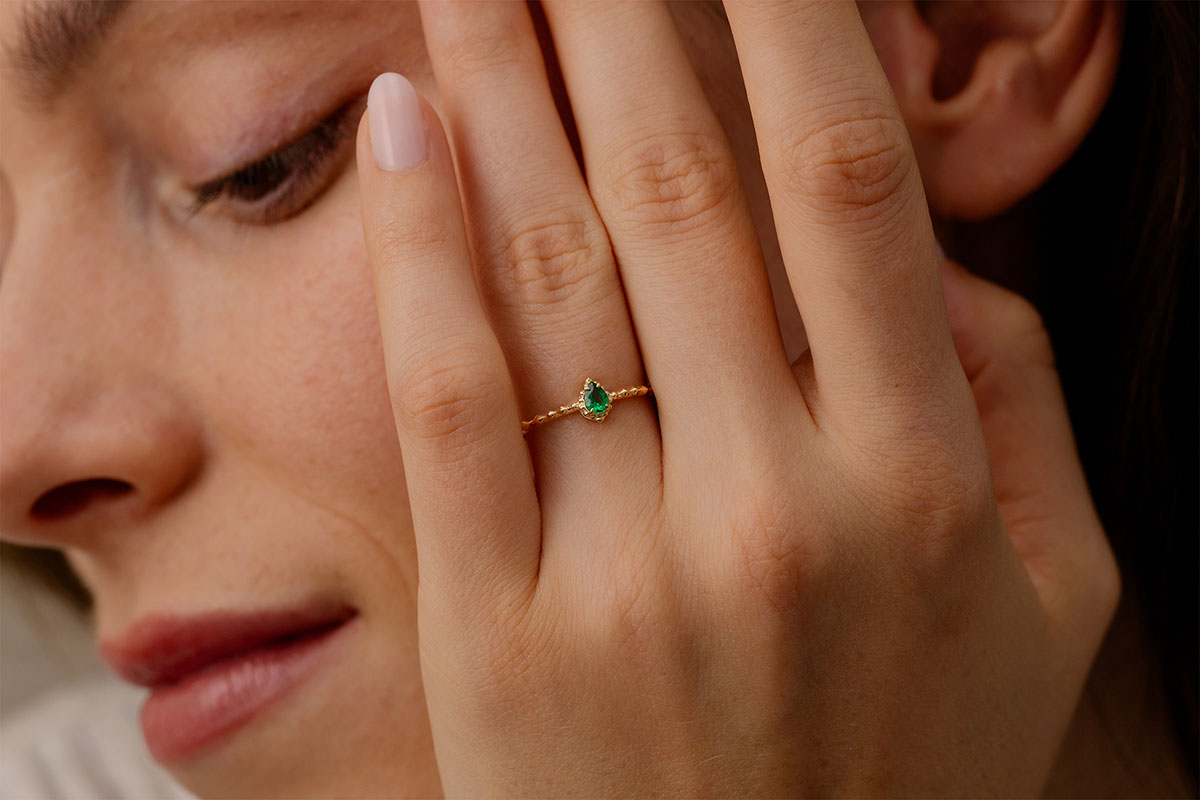 Ein 0,3-Karat-Smaragd erstrahlt auf einem Ring mit pyramidenförmig geschliffenen Facetten, die das Licht bei jeder Bewegung einfangen.Ein mutiges und wertvolles Schmuckstück – wie ein Versprechen von Charakter in Ihrer Hand.