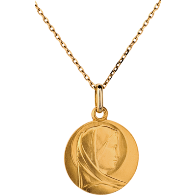 Eine schlichte und elegante Darstellung der verschleierten Jungfrau mit Heiligenschein. Eine klassischer Münzanhänger zur Taufe. Ohne Kette. Gelbgold (750/-): 2 g. Weitere Abmessungen