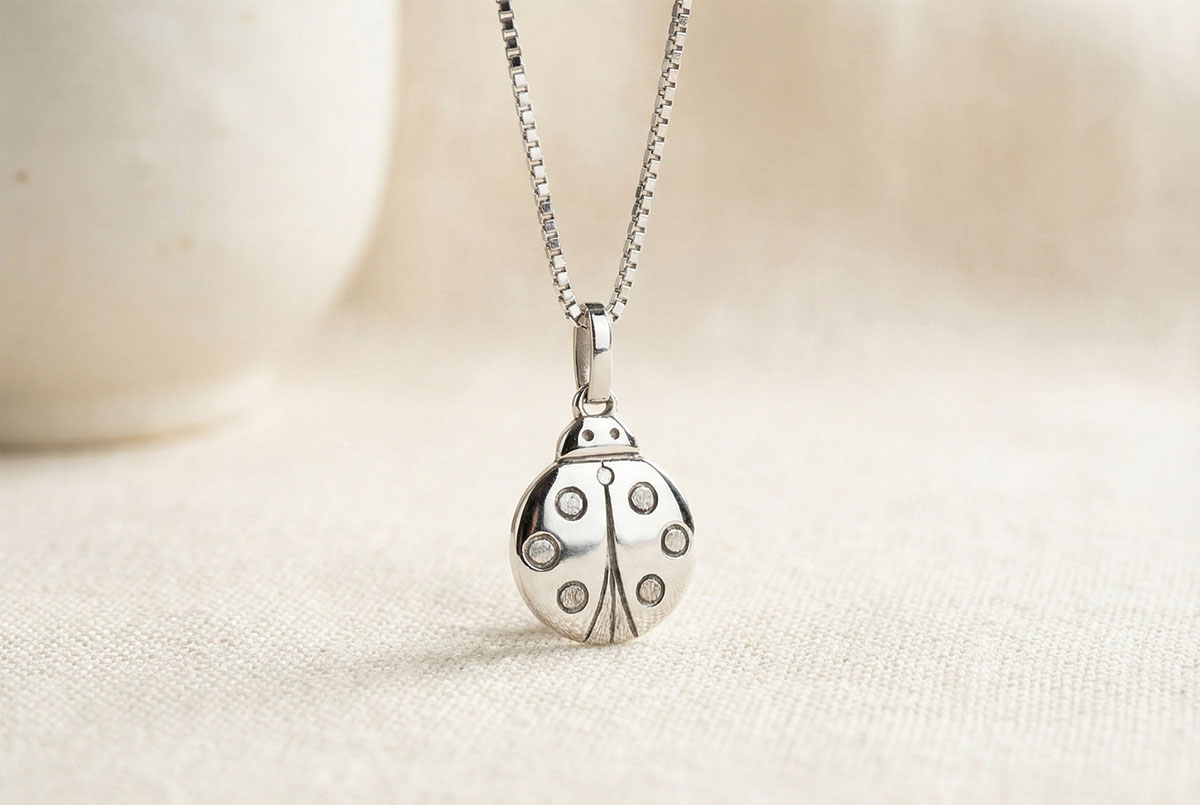 Ein weißgoldener Marienkäfer mit runden und zarten Formen ist ein echter Glücksbringer. Sein siebter Punkt ist ein kleiner Diamant. Großes Modell. Ohne Kette. 1 Diamant : 0.05 Karat - Weißgold (375/-): 0.9 g. Weitere Abmessungen