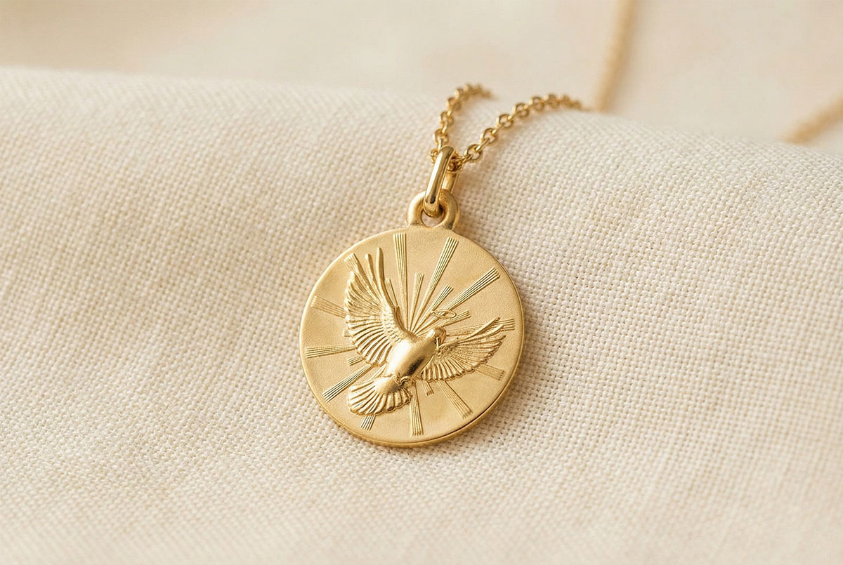 Diese Medaille aus Gelbgold zeigt den Heiligen Geist in Form einer Taube, ein kraftvolles Symbol für göttlichen Frieden und himmlische Liebe. Das Bild der Taube, begleitet von ihrem leuchtenden Heiligenschein, ist von Lichtstrahlen umgeben, die Gnade und Segen symbolisieren. Dieses fein gearbeitete Schmuckstück verkörpert Reinheit und göttliche Präsenz und bietet eine Botschaft von Gelassenheit und Schutz. Ideal für Taufe, Kommunion oder spirituelle Anlässe, spiegelt es Glauben und Hoffnung wider, um es mit Hingabe zu tragen oder zu schenken.