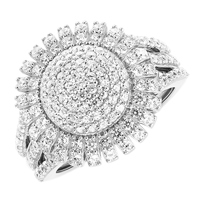 Der Nova Ring besticht durch sein innovatives Design und eine Fülle meisterhaft gefasster synthetischer Diamanten. Das strahlende Zentrum erinnert an die Explosion eines Sterns und verleiht dem Schmuckstück eine majestätische Ausstrahlung. Weißgold (375/-): 7.3 g. Labordiamant : 147 - Total: 1.38 Karat Weitere Abmessungen