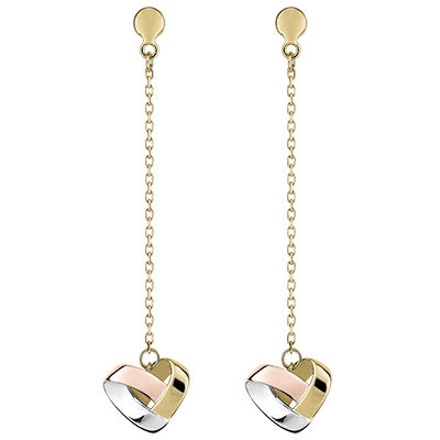 Das Herz - Ikone des Juwelierhandwerks - wurde von Edenly in einer Origami-Version überarbeitet, in der sich die drei Goldfarben mit Originalität und Eleganz verbinden. Hier ein Modell von Ohrringen mit Kettchen, welche die sanften und weichen Bewegungen des Gesichts begleiten. Tricolor (750/-): 1.2 g. Weitere Abmessungen