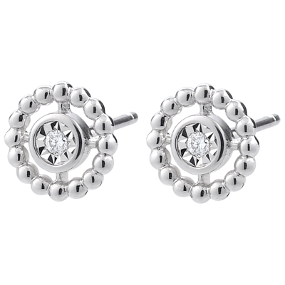 Ein Ring aus weißgoldenen Perlen umschließt einen erlesenen Solitärdiamanten in seiner Mitte. 2 Diamanten : 0.02 Karat - Weißgold (375/-): 0.8 g. Weitere Abmessungen