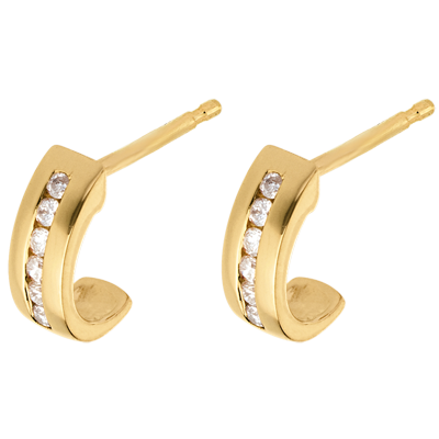 Gelbgoldene Halbcreolen auf denen funkelnde Diamanten in einer Kanalfassung aneinandergereiht sind. 12 Diamanten : 0.11 Karat - Gelbgold (750/-): 1.3 g. Weitere Abmessungen