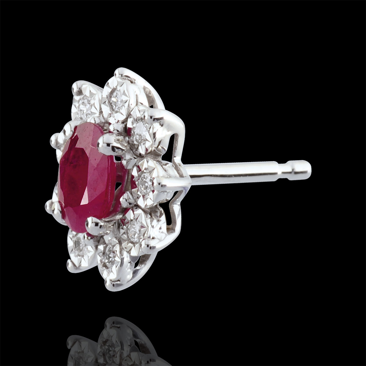 Ein ovaler synthetischer Rubin bildet auf jedem Stecker das Zentrum einer Margerite aus Weißgold, besetzt mit Labordiamanten. 18 Diamanten: 0,11 Karat. Rubine: 2 – Gesamt: 0,88 Karat. Abmessungen der Rubine: Länge: 5 mm – Breite: 4 mm – Dicke: 3 mm. Weißgold (750/-): 2.1 g. Synthetischer Rubin : 2 - Labordiamant : 18 - Total: 0.99 Karat Weitere Abmessungen