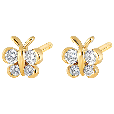 Ein kleiner Schmetterling aus Gelbgold mit weichen, runden Formen, dessen Flügel mit zarten Diamanten besetzt sind. 8 Diamanten : 0.16 Karat - Gelbgold (375/-): 1 g. Weitere Abmessungen