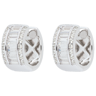 Drei Diamantreihen in Brillant- und Baguetteschliff, die im Zusammenspiel mit dem hochwertigen Weißgold, einen strukturellen und aufwendigen Effekt erzielen. 46 Diamanten : 2.12 Karat - Weißgold (750/-): 10.4 g. Weitere Abmessungen