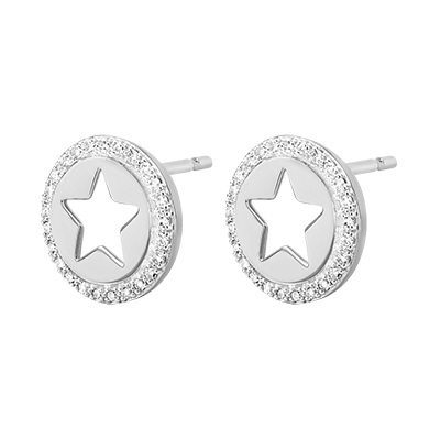 Die "Stellar"-Ohrringe zeigen einen hohlen Stern aus Weißgold in der Mitte, umgeben von funkelnden Diamanten.