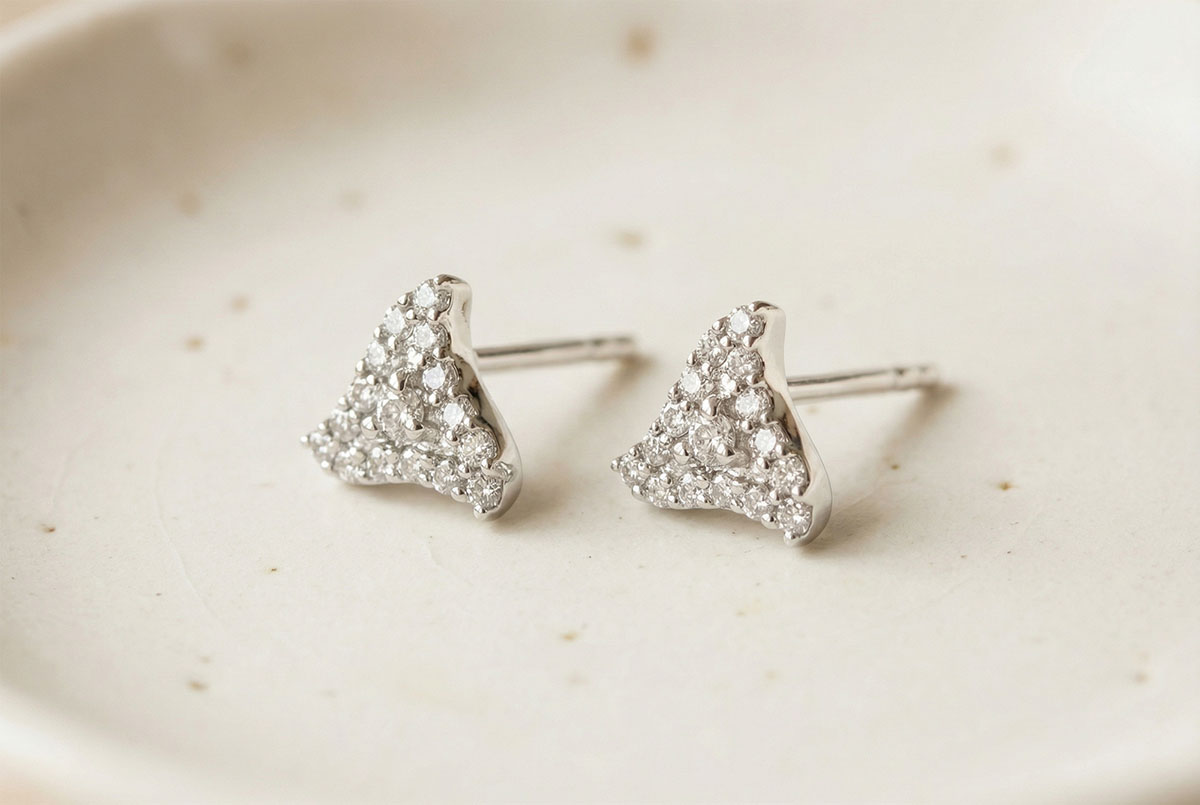 Ohrringe mit Retro- und Barockkurven, bestehend aus einem zentralen Diamanten, welcher von weiteren Diamanten umgeben ist.
