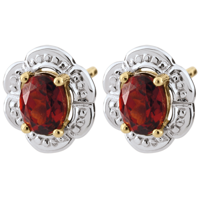 Ein Paar blumige Ohrstecker besetzt mit zwei Granaten, umrandet von einer Blumenkrone aus Weißgold. Fassung aus Gelbgold. Weiß-und Gelbgold (375/-): 1.1 g. Granat : 2 - Total: 0.93 Karat Weitere Abmessungen