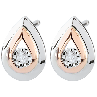 Zwei feine Tropfen aus Weißgold und Roségold, deren Zentrum ein schillernder Diamant bildet.