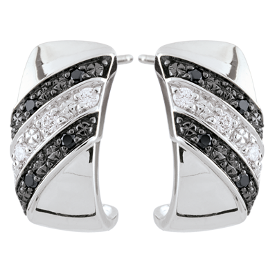 Streifen aus glänzendem Gold, welche reichlich mit schwarzen und weißen Diamantenpavés geschmückt sind, um die Orginalität und die Weiblichkeit ihrer Trägerin zu unterstreichen. 6 Diamanten : 0.09 Karat - Weißgold (375/-): 2.4 g. Schwarzer Diamant : 8 - Total: 0.064 Karat Weitere Abmessungen