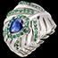 Der Ring ist mit einem zentralen 0,650 Karat birnenförmigen synthetischen Saphir und 48 grünen synthetischen Smaragden besetzt.