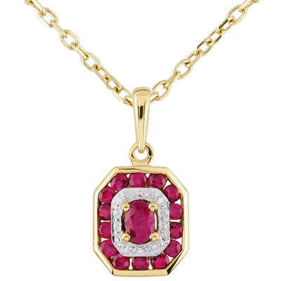 Ein Achteck aus Gelbgold, besetzt mit Rubinen. Das Weißgold ist in Form von Diamanten gearbeitet. In der Mitte besticht ein ovaler Rubin. Ein elegantes und zeitloses Schmuckstück. Ohne Kette. Gelbgold (375/-): 1 g. Rubin : 15 - Total: 0.72 Karat Weitere Abmessungen