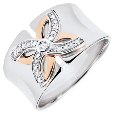 Eine Lilie in edlem Weiß- und Roségold thront auf einem eleganten, breiten Ring. 9 Diamanten : 0.04 Karat - Weiß-und Rotgold (375/-): 4.6 g. Weitere Abmessungen