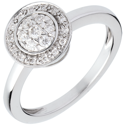 Ein funkelnder Diamant umringt von funkelnden Diamanten, ein glanzvoller Ring. 21 Diamanten : 0.2 Karat - Weißgold (750/-): 3.4 g. Pavé aus natürlichen Diamanten : - Weitere Abmessungen