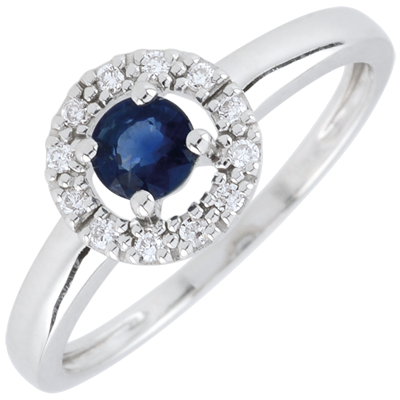 Ein mit Diamanten besetzter Kreis lässt einen Saphir erstrahlen. 12 Diamanten : 0.07 Karat - Weißgold (750/-): 1.9 g. Blauer Saphir : 1 - Total: 0.36 Karat Weitere Abmessungen