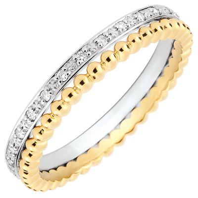Ein diamantbesetzter Ring in Weißgold vereint mit einem Ring aus gelbgoldenen Perlen bilden ein anmutiges Duo. Ein Trauring mit weiblicher Note, klassisch und originell zugleich. 13 Diamanten : 0.05 Karat - Weiß-und Gelbgold (750/-): 2.8 g. Weitere Abmessungen