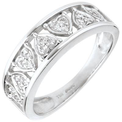 Funkelnde Diamantherzen in einer weißgoldenen Fassung, welche die Weiblichkeit dieses Ringes perfekt zur Geltung bringen. 21 Diamanten : 0.1 Karat - Weißgold (750/-): 3.7 g. Weitere Abmessungen
