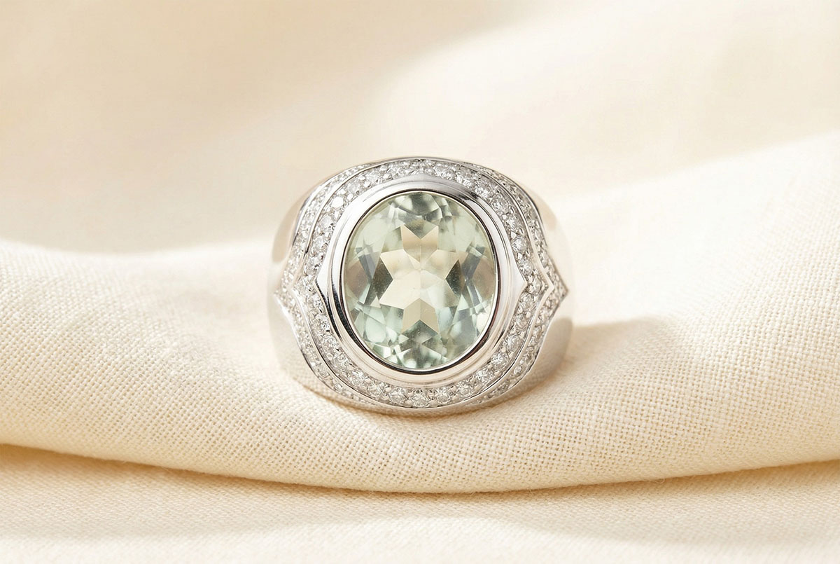 Eine grüner und ovaler Amethyst wird von zwei Reihen Diamanten umrandet, die die Form eines göttlichen Auges annehmen.