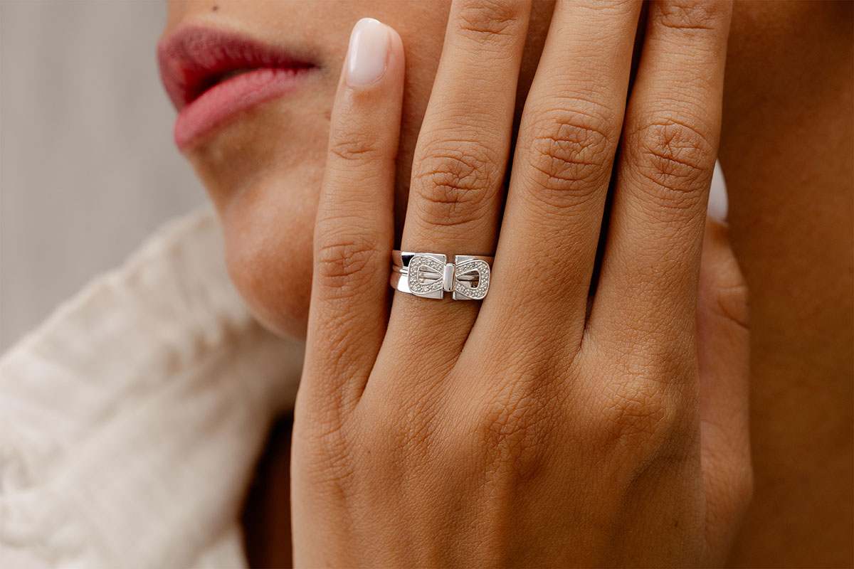 Ein Band aus Weißgold verbunden durch eine mit Diamanten verzierten Schleife aus Weißgold.