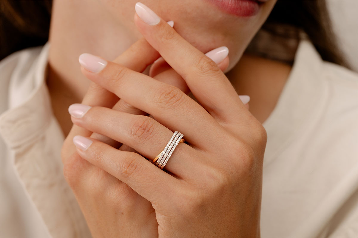 Ein glamouröser Ring aus Weissgold, besetzt mit drei Diamantenreihen, wird von einem zarten Gelbgoldring begleitet.