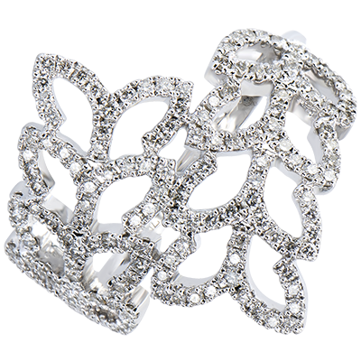 Bukolische Romantik für diesen so frischen und femininen Ring, in dem sich eine durchbrochene, mit Diamanten besetzte Flora verflechtet. Die ganze Zartheit der Formen der Natur in einem subtilen und fast magischen Schmuckstück. 144 Diamanten : 0.53 Karat - Weißgold (750/-): 4.4 g. Weitere Abmessungen