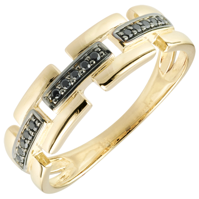 Ein erlesener Goldring, welcher sich stellenweise in eine Zweierreihe spaltet und von edlen schwarzen Diamanten unterbrochen wird. Die Ringe der Dämmerschein-Kollektion wirken modern und sehr feminin. 15 Diamanten : 0.08 Karat - Gelbgold (375/-): 1.7 g. Weitere Abmessungen
