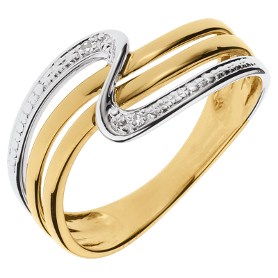 Eine doppelrangige Fassung aus Gelbgold ist verziert mit einer geschwungenen Linie aus diamantbesetztem Weissgold. 2 Diamanten : 0.01 Karat - Weiß-und Gelbgold (750/-): 2.5 g. Weitere Abmessungen