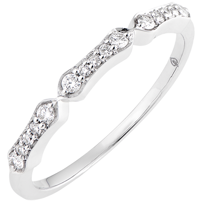 Ein moderner und zarter Ring, der aus einem Trio kleiner diamantbesetzter Glieder besteht. In Verbindung mit anderen Ringen oder allein als Ehering zu tragen. 15 Diamanten : 0.13 Karat - Weißgold (750/-): 1.7 g. Weitere Abmessungen