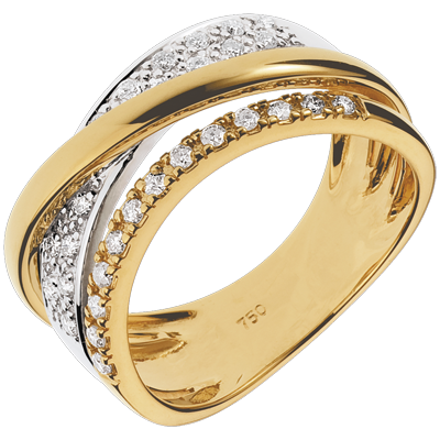Zwei Ringe in Gelb- und Weißgold, die großzügig mit Diamanten besetzt sind, werden von einem gelbgoldenen Band aufegegriffen. Dieser Ring nimmt Sie mit auf die Reise, vorbei an den Sternen, in Richtung Saturn. 29 Diamanten : 0.27 Karat - Weiß-und Gelbgold (750/-): 4.4 g. Weitere Abmessungen