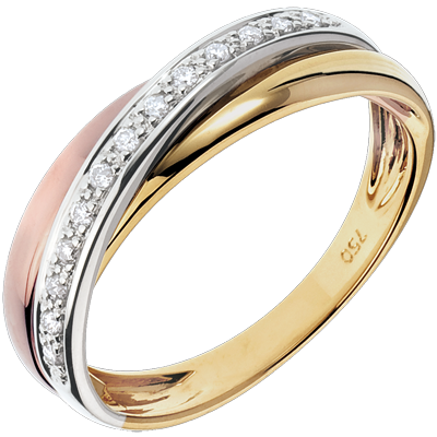 Die Besonderheit dieses Traurings rührt aus der harmonischen Verbindung von dreierlei Goldfarben, die von einem diamantbestetzten Band in Weißgold durchquert werden. 13 Diamanten : 0.1 Karat - Tricolor (750/-): 3.5 g. Weitere Abmessungen