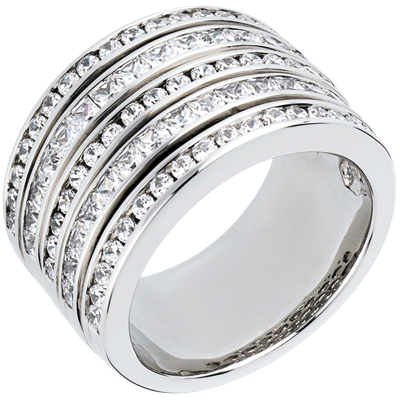 Ihre umwerfende und stilechte Fassung machen die fünf Diamantreihen in Halbpavé dieses Ringes zu einem schillernden Ereignis. 81 Diamanten : 2.42 Karat - Weißgold (750/-): 16.8 g. Weitere Abmessungen