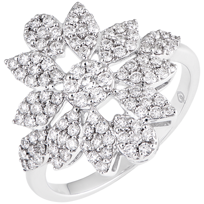 Ein blumiges Motiv, das in einem kaiserlichen und kostbaren Stil neu aufgegriffen wurde und diesen grafischen Ring mit diamantbesetzten Blütenblättern entstehen lässt. Ein kraftvolles und majestätisches Modell und ein nahezu verzaubertes Schmuckstück. 111 Diamanten : 0.75 Karat - Weißgold (375/-): 2.9 g. Weitere Abmessungen