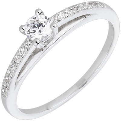Ein Solitärdiamant stellt sich in Begleitung von einer Vielzahl kleiner Brillanten vor, welche auf einer weißgoldenen Fassung um die Wette strahlen. 17 Diamanten : 0.31 Karat - Weißgold (750/-): 2.4 g. Weitere Abmessungen