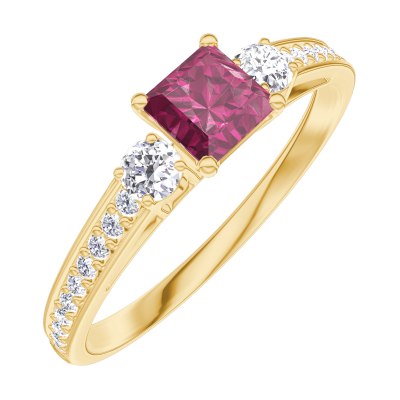 « L'ATELIER » Nº160725Ring Gelbgold 750/-(18Kt) - Rubin Prinzess 0.3 Karat - Seitliche Steine Diamant - Fassung Diamant