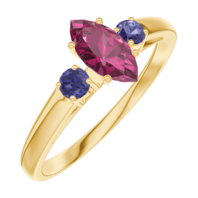 « L'ATELIER » NR. 161162Ring Gelbgold 375/-(9Kt) - Rubin Marquise 0.3 Karat - Seitliche Steine Blauer Saphir