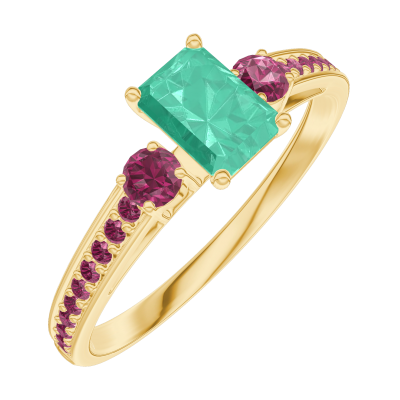 « L'ATELIER » Nº162049Ring Gelbgold 750/-(18Kt) - Smaragd Rechteckig 0.3 Karat - Seitliche Steine Rubin - Fassung Rubin