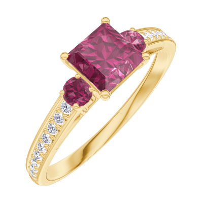 « L'ATELIER » Nº163145Ring Gelbgold 750/-(18Kt) - Rubin Prinzess 0.5 Karat - Seitliche Steine Rubin - Fassung Diamant