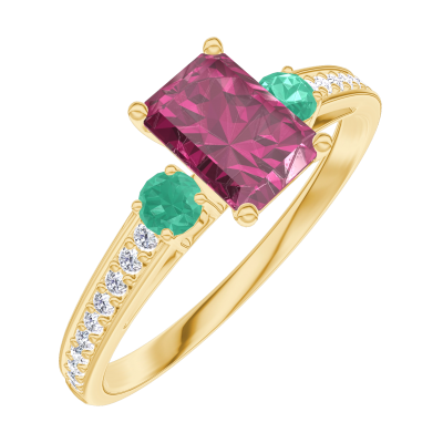 « L'ATELIER » Nº163285Ring Gelbgold 750/-(18Kt) - Rubin Rechteckig 0.5 Karat - Seitliche Steine Smaragd - Fassung Diamant