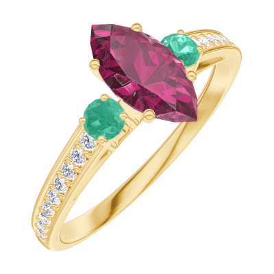 « L'ATELIER » Nº163586Ring Gelbgold 375/-(9Kt) - Rubin Marquise 0.5 Karat - Seitliche Steine Smaragd - Fassung Diamant