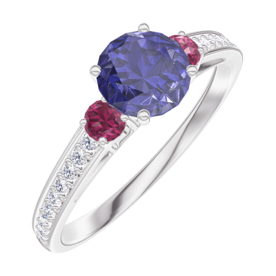 « L'ATELIER » NR. 163648Ring Weißgold 375/-(9Kt) - Blauer Saphir rund 0.5 Karat - Seitliche Steine Rubin - Fassung Diamant 4.5