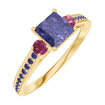 « L'ATELIER » NR. 163754Ring Gelbgold 375/-(9Kt) - Blauer Saphir Prinzess 0.5 Karat - Seitliche Steine Rubin - Fassung Blauer Saphir