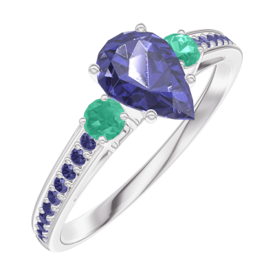 « L'ATELIER » NR. 164095Ring Weißgold 750/-(18Kt) - Blauer Saphir Tropfen 0.5 Karat - Seitliche Steine Smaragd - Fassung Blauer Saphir