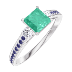 Ring Weißgold 375/-(9Kt) - Smaragd Prinzess 0.5 Karat - Seitliche Steine Diamant - Fassung Blauer Saphir